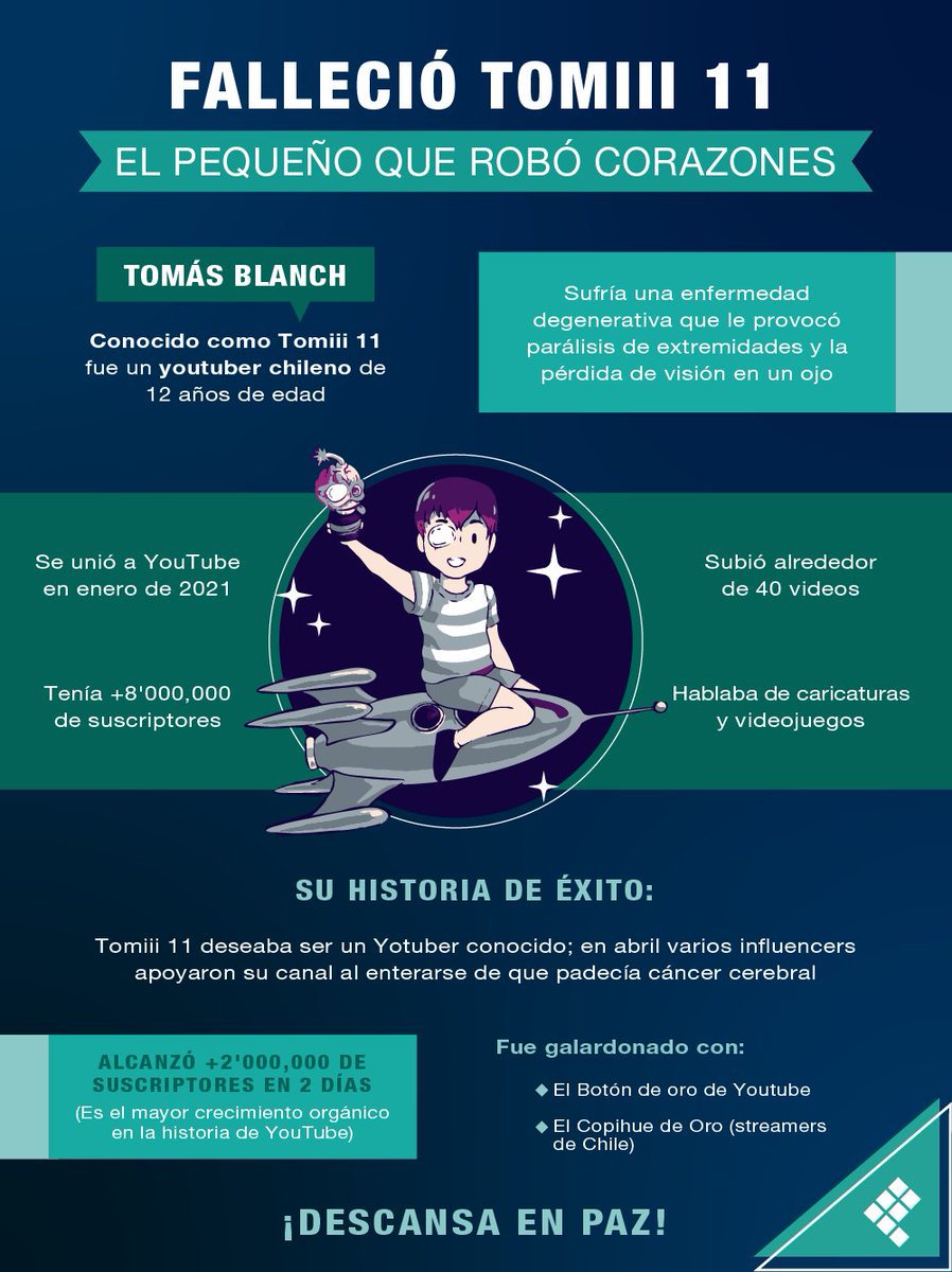 El niño chileno tomás blanch, conocido como tomiii 11, que soñaba con convertirse en un famoso youtuber, falleció este lunes a los 12 años de edad. En sus videos tomiii 11 básicamente habla los temas que le gustan, le manda saludos a sus gracias a la convocatoria hecha en diversos medios es que hoy tomiii 11 tiene más de 3.5 millones. Who exactly is tomiii 11 on youtube? La triste noticia fue confirmada por medios de chile y ha consternado en redes sociales. Tomiii 11 o, como algún usuario de youtube ha querido describirle: